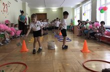 Ребята старших и подготовительных групп показали свою удаль и спортивные способности на праздничном мероприятии. Разминка, эстафеты и спортивные игры предлагались от лица сказочных героев. Дети загоняли воздушные шары в ворота, прыгали в мешках. Девочки не отставали от мальчиков, все состязания ребята прошли на "отлично", показав свою ловкость и желание быть первыми.