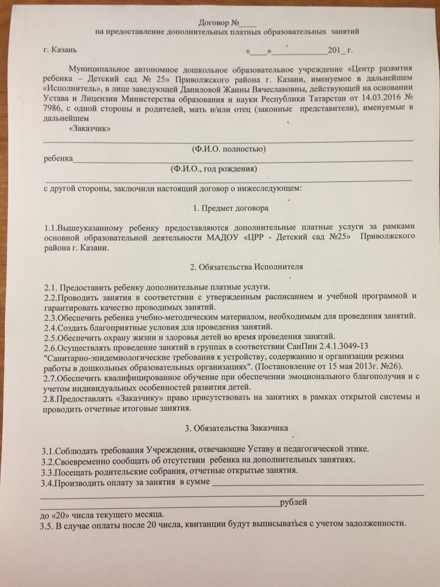 Договор на дополнительные платные услуги 1 стр