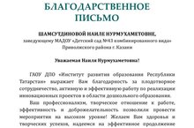 ГАОУ ДПО "Институт развития образования Республики Татарстан" выражает благодарность Шамсутдиновой Н.Н. за плодотворное сотрудничество, активную и эффективную работу по реализации инновационных проектов в области дошкольного образования.