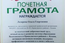 За многолетний добросовестный труд, личный вклад в развитие системы образования Вахитовского и Приволжского районов города Казани, активную жизненную позицию, поддержку профсоюзного движения и в связи с юбилеем , председатель профкома нашего МАДОУ Лазарева Ольга Георгиевна, награждена почетной грамотой! Поздраляем!
