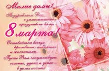 Милые женщины, поздравляем с праздником весны!Цвести желаем, расцветатьСвои мечты осуществлятьПо-королевски всегда житьИ быть любимыми, Л Ю Б И Т Ь!Пускай весна вам принесетВеселье, радость и доходЗдоровья нежности, добраЧтоб быть счастливей чем вчера,Пусть этой светлою веснойМир будет яркий и цветной,Чтоб каждый миг и каждый часЖдала кругом удача вас!