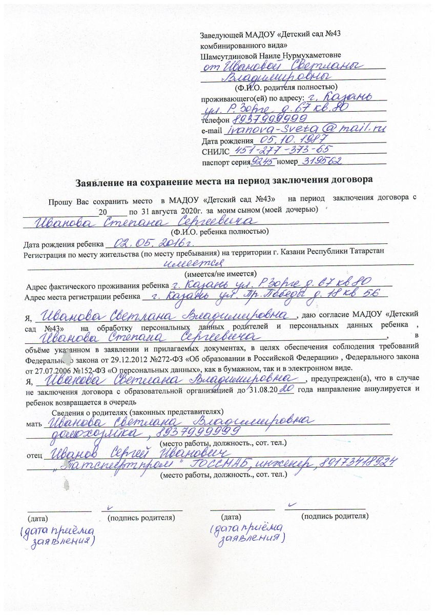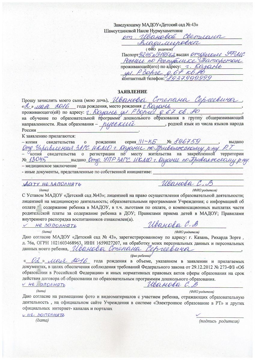 Для зачисления вам необходимо распечатать и заполнить бланки представленные ниже (договор распечатываем и заполняем в двух экземплярах), а так же сделать копии документов: свидетельство о рождении ребенка, справка о регистрации в г.Казань, снилс ребенка, медицинский полис ребенка, паспорта родителей (первая страница и прописка), снилсы родителей. Образцы заполнения документов так же представлены в этой вкладке. Все это вложить в файлы папки скоросшивателя. С готовым комплектом документов необходимо подойти в детский сад в назначенное время и дату. При себе иметь шариковую ручку. Посетители допускаются только в масках и перчатках.