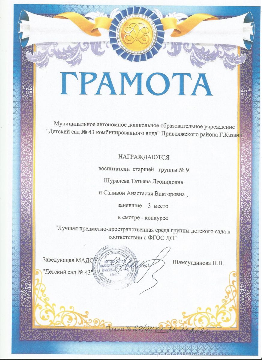 Грамота воспитателям группы 9 в конкурсе лучшая предметно-пространственная среда группы