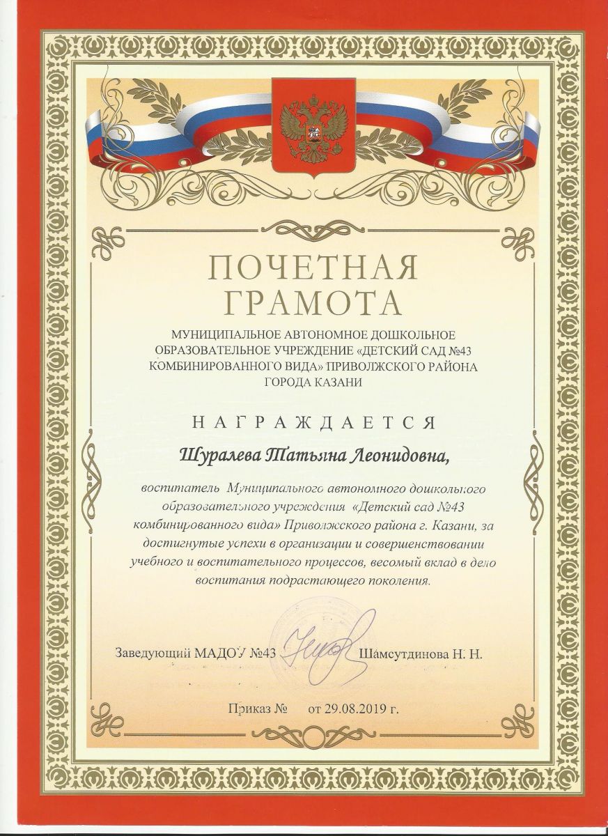 Почётная грамота Шуралёвой Т_Л_ за достигнутые успехи
