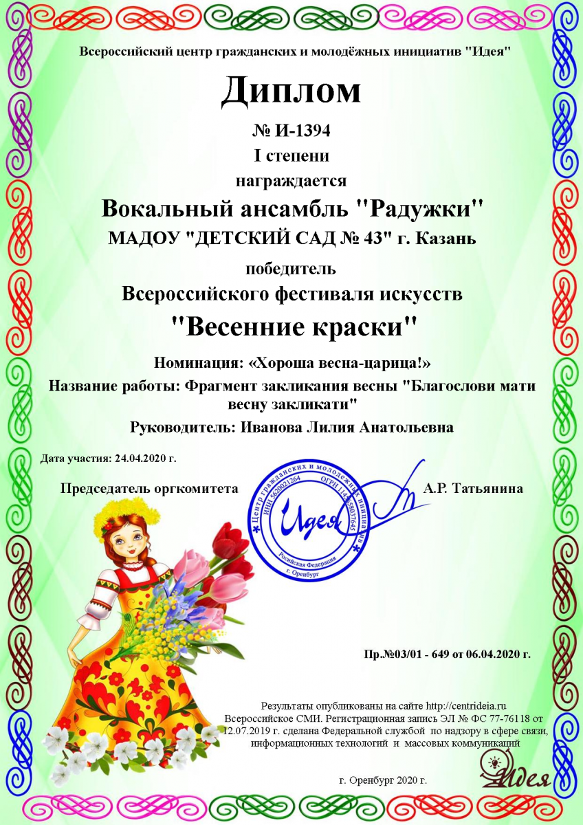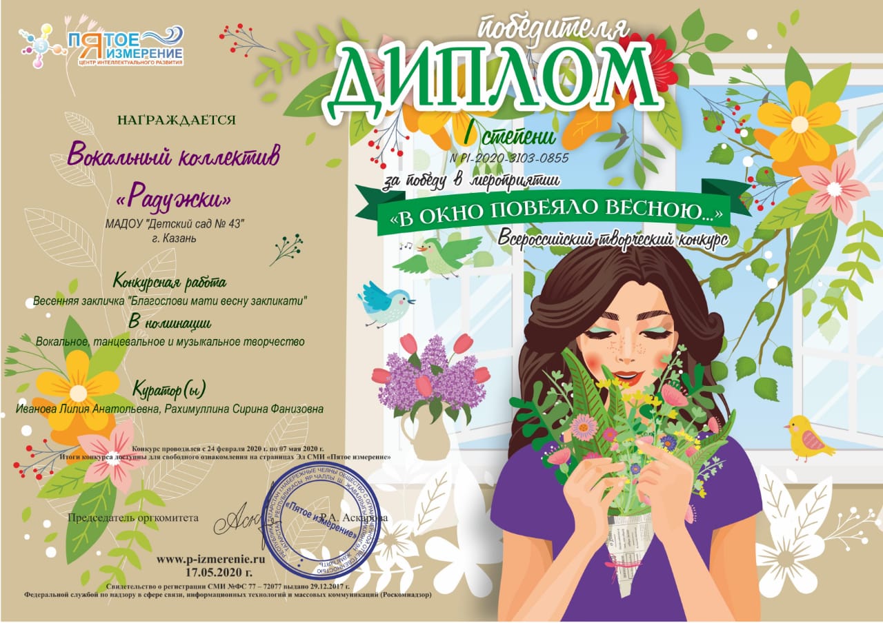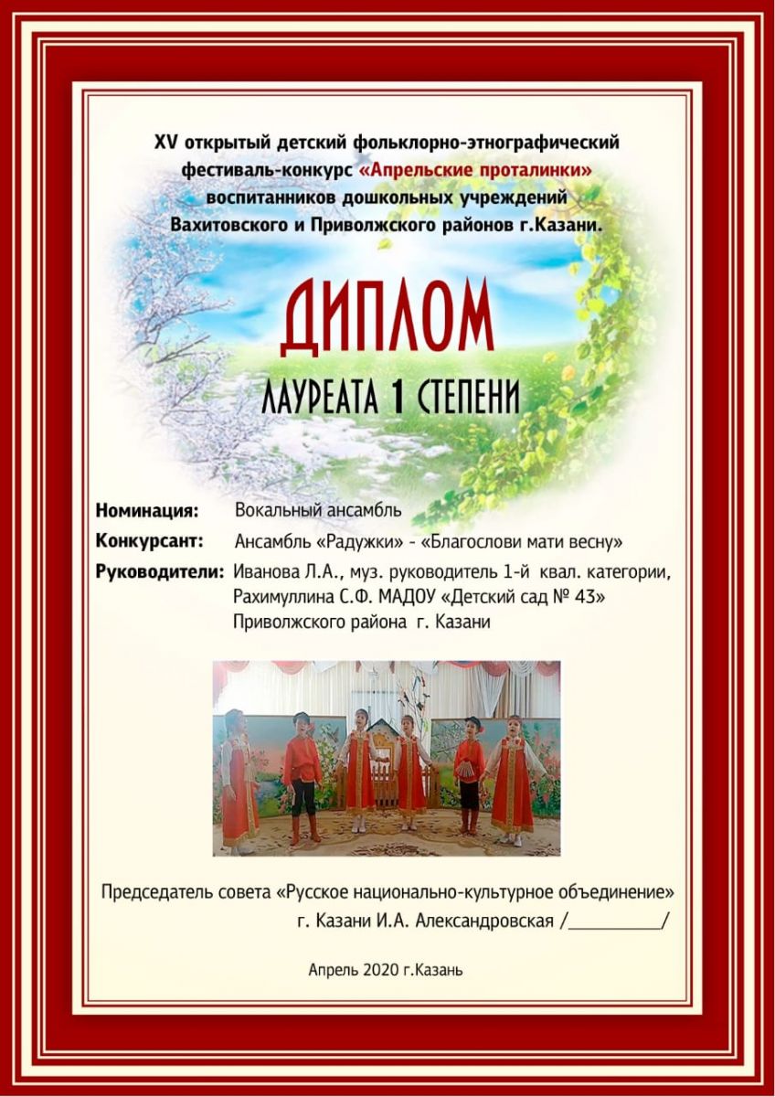 - Диплом лауреата 1 степени Апрельские проталинки Иванова 2020.