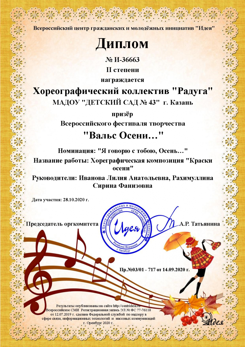 - Диплом 2 степени Хореографический коллектив "Радуга" Всероссийский фестиваль "Вальс Осени" Кураторы Иванова Л.А, Рахматуллина С.Ф