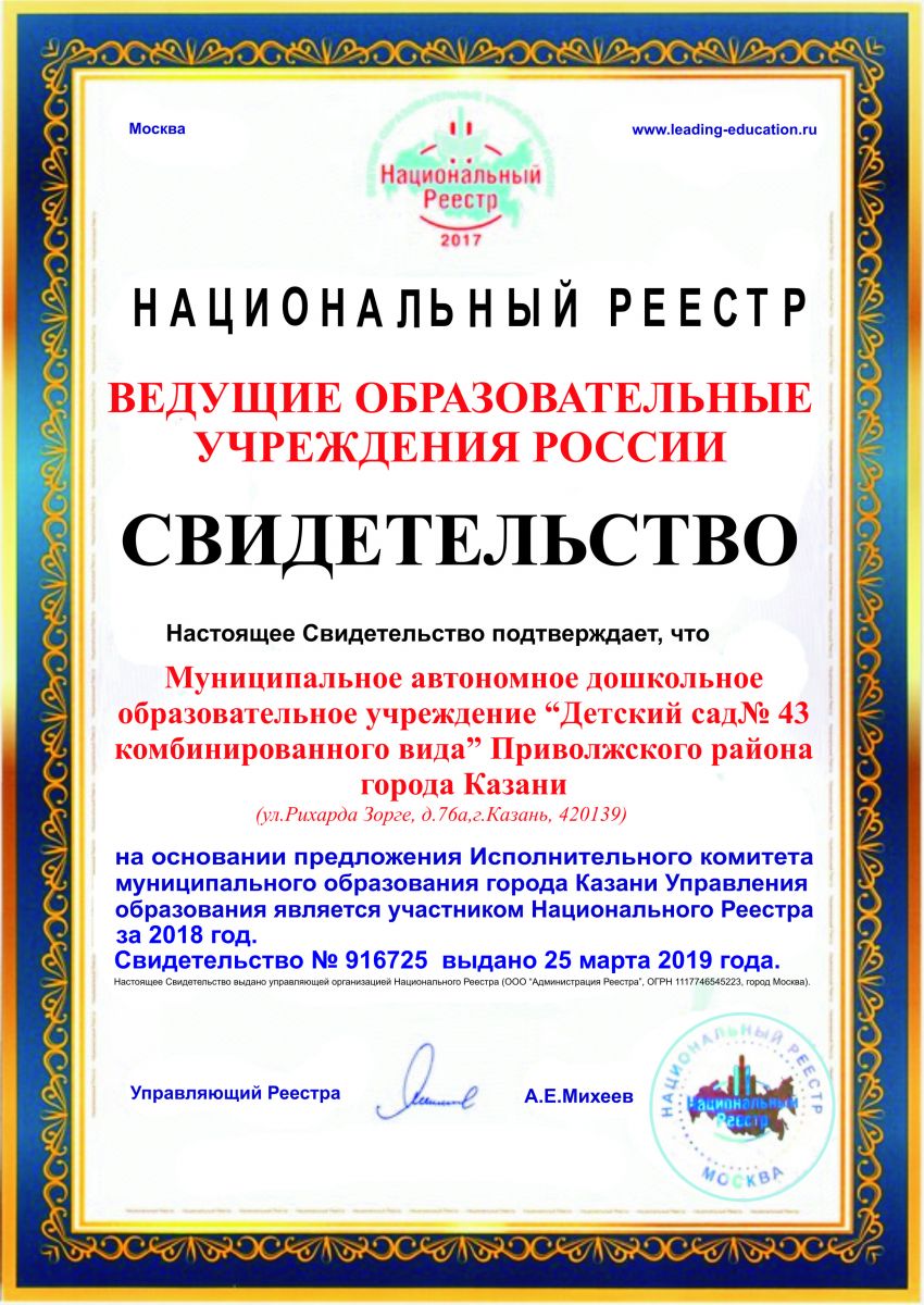 Муниципальное автономное дошкольное образовательное учреждение "Детский сад №43 комбинированного вида" Приволжского района г.Казани