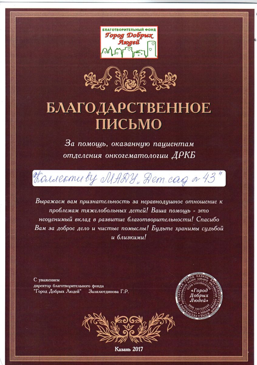 - Благодарственное письмо коллектива детского сада за оказанную помощь пациентам отделения онкогематологии ДРКБ