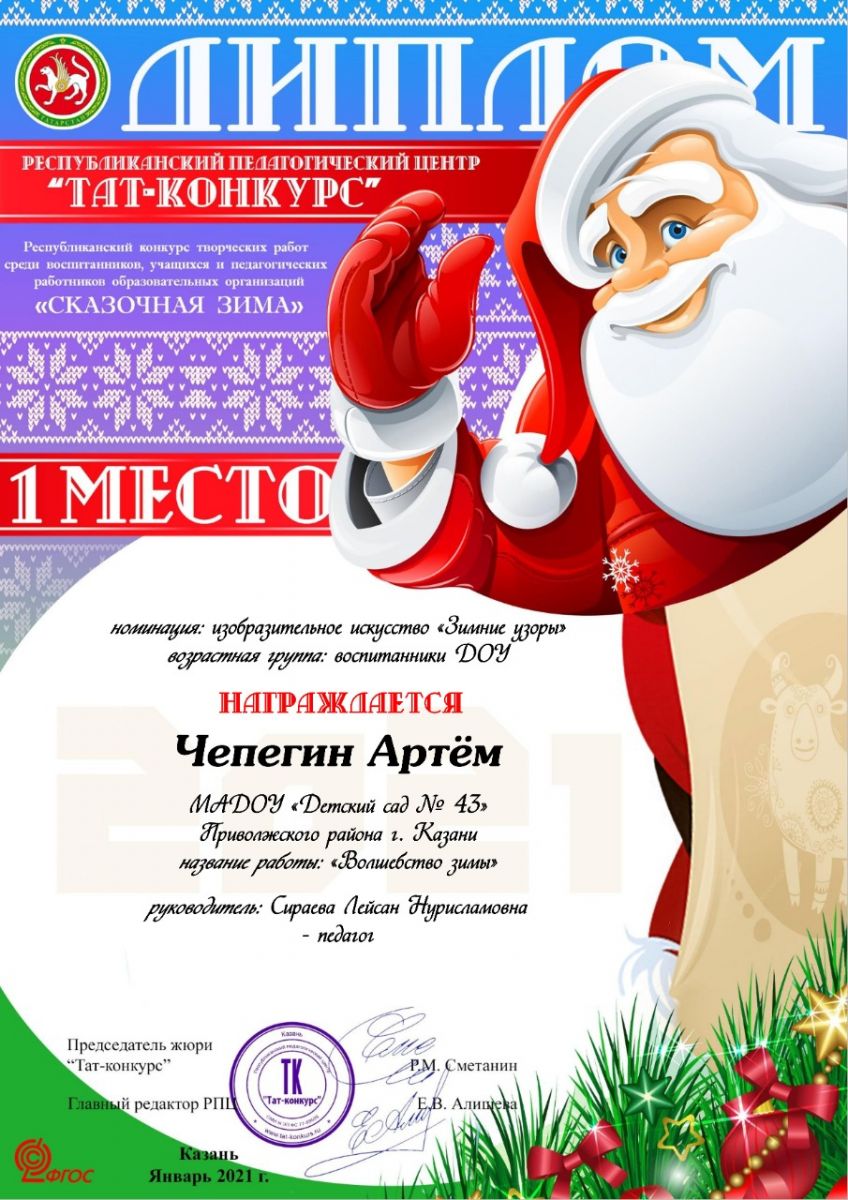 - Диплом 1 место Чепегин Артём Республиканский Тат-Конкурс "Зимняя сказка"