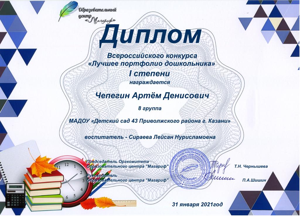 - Диплом 1 место Чепегин Артём Всероссийский конкурс "Лучшее портфолио дошкольника"