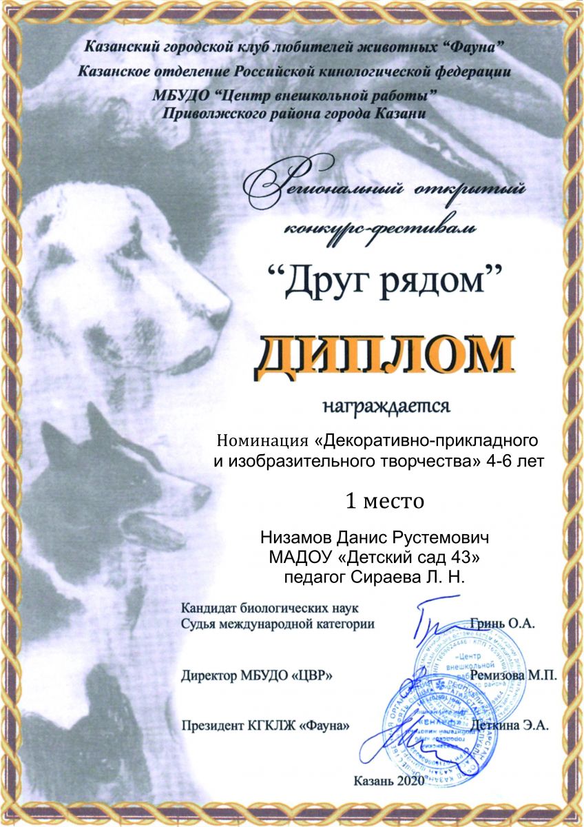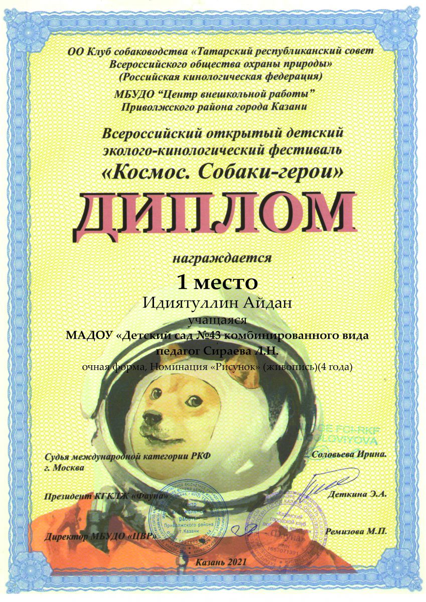 - Диплом 1 место Идиятуллин Айдан Всероссийский открытый детский эколого-кинологический фестиваль "Космос. Собаки-герои"