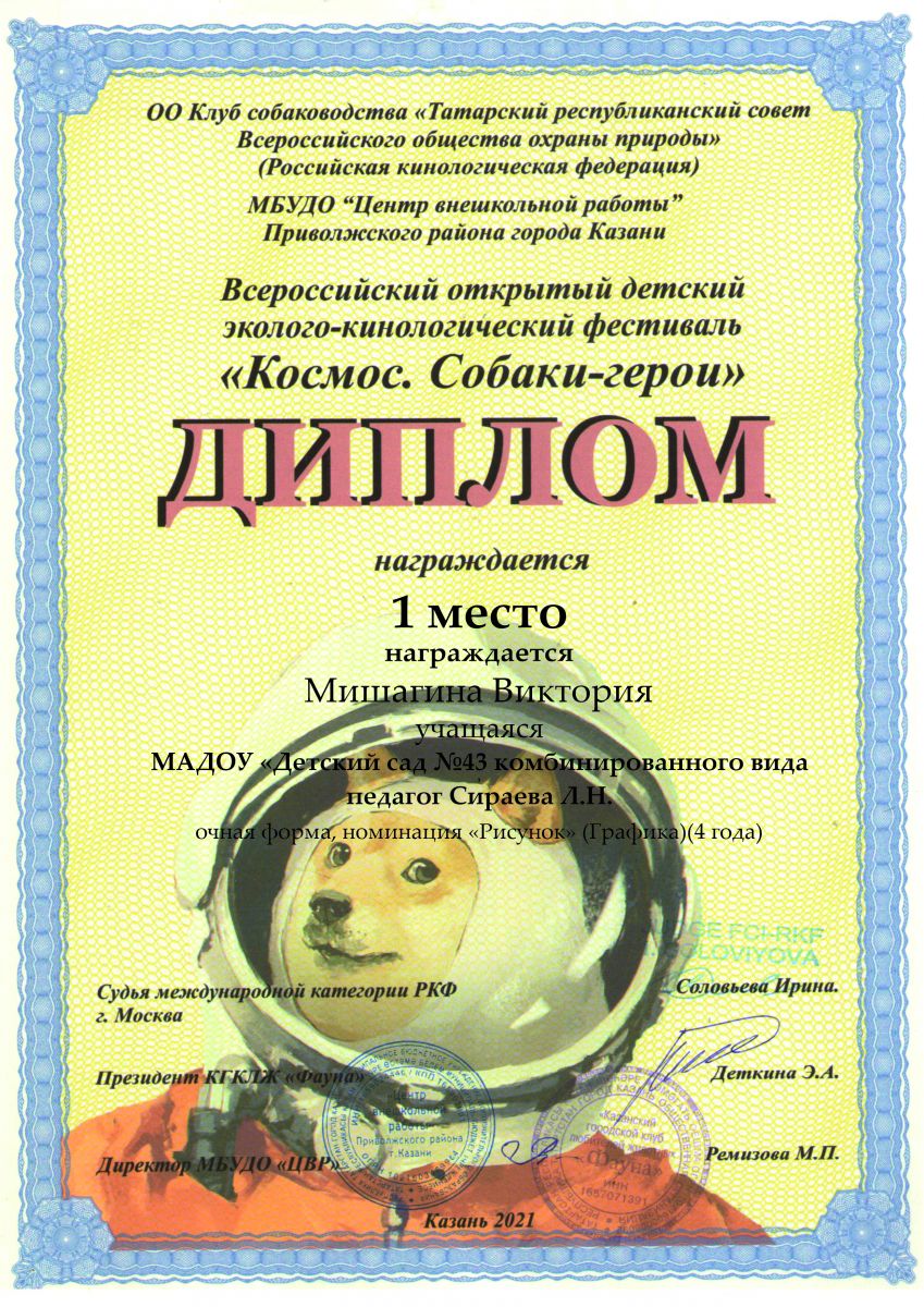 - Диплом 1 место Мишагина Виктория Всероссийский открытый детский эколого-кинологический фестиваль "Космос. Собаки-герои"