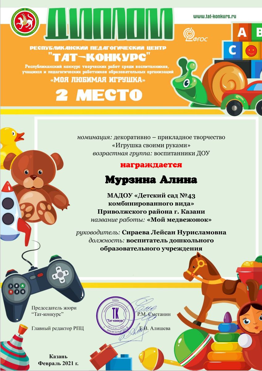 - Диплом 2 место Мурзина Алина Республиканский ТАТ-КОНКУРС "МОЯ ЛЮБИМАЯ ИГРУШКА"