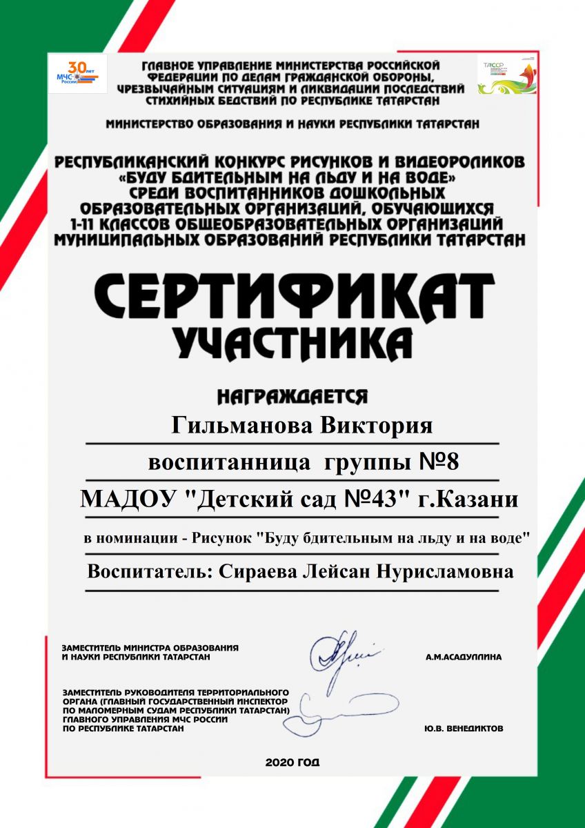 - Сертификат участника Гильмановой Виктории 8 гр Республиканский конкурс рисунков и видеороликов "Буду бдительным на льду и на воде"