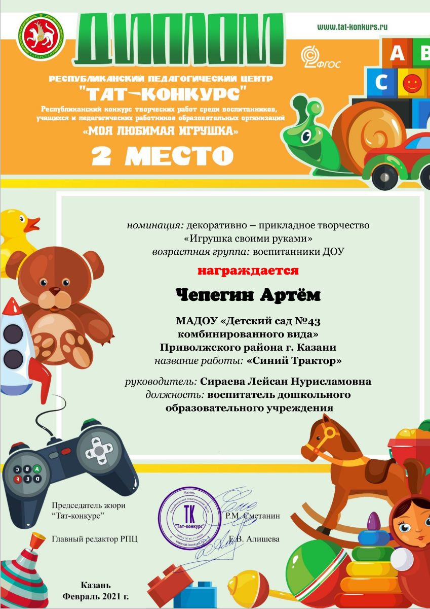 - Диплом 2 место Чепегин Артём Республиканский ТАТ-КОНКУРС "МОЯ ЛЮБИМАЯ ИГРУШКА"