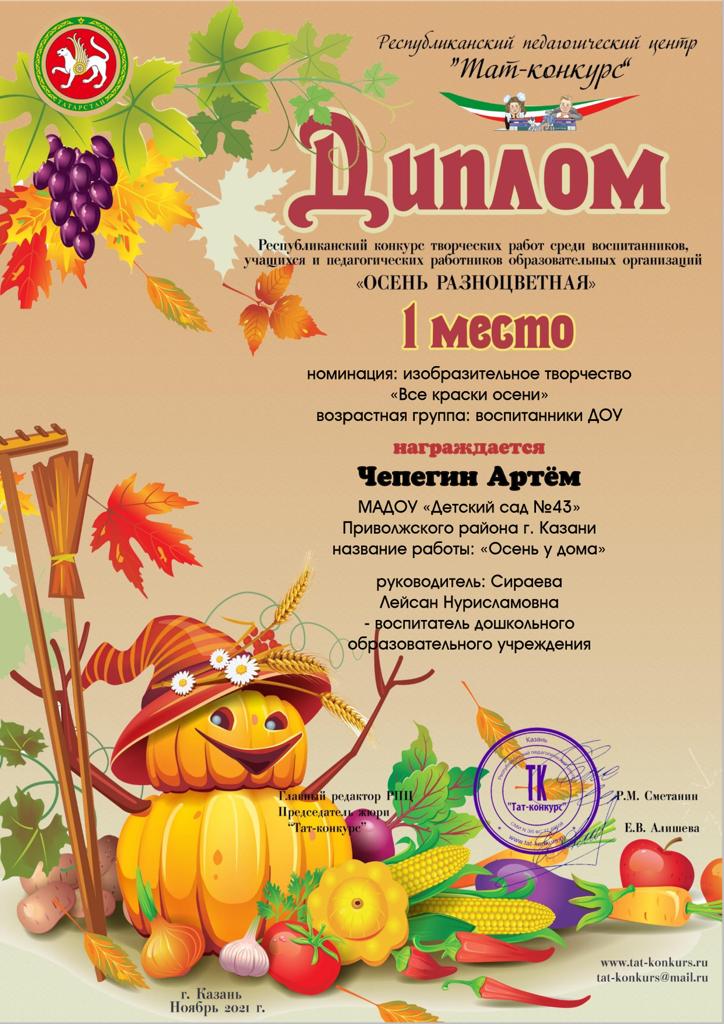 - Диплом 1 место Чепегин Артём Республиканский ТАТ-КОНКУРС "Осень разноцветная"