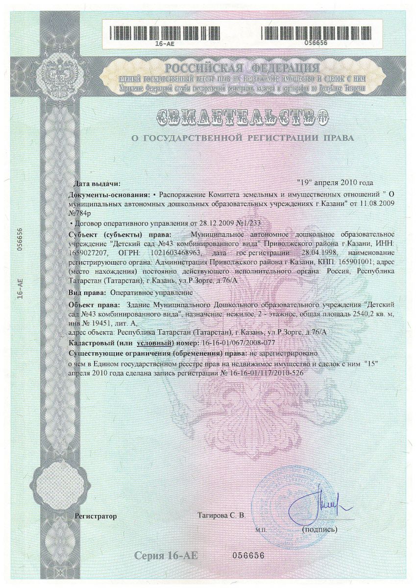 Свидетельство о гос.регистрации здания от 19.04.2010г