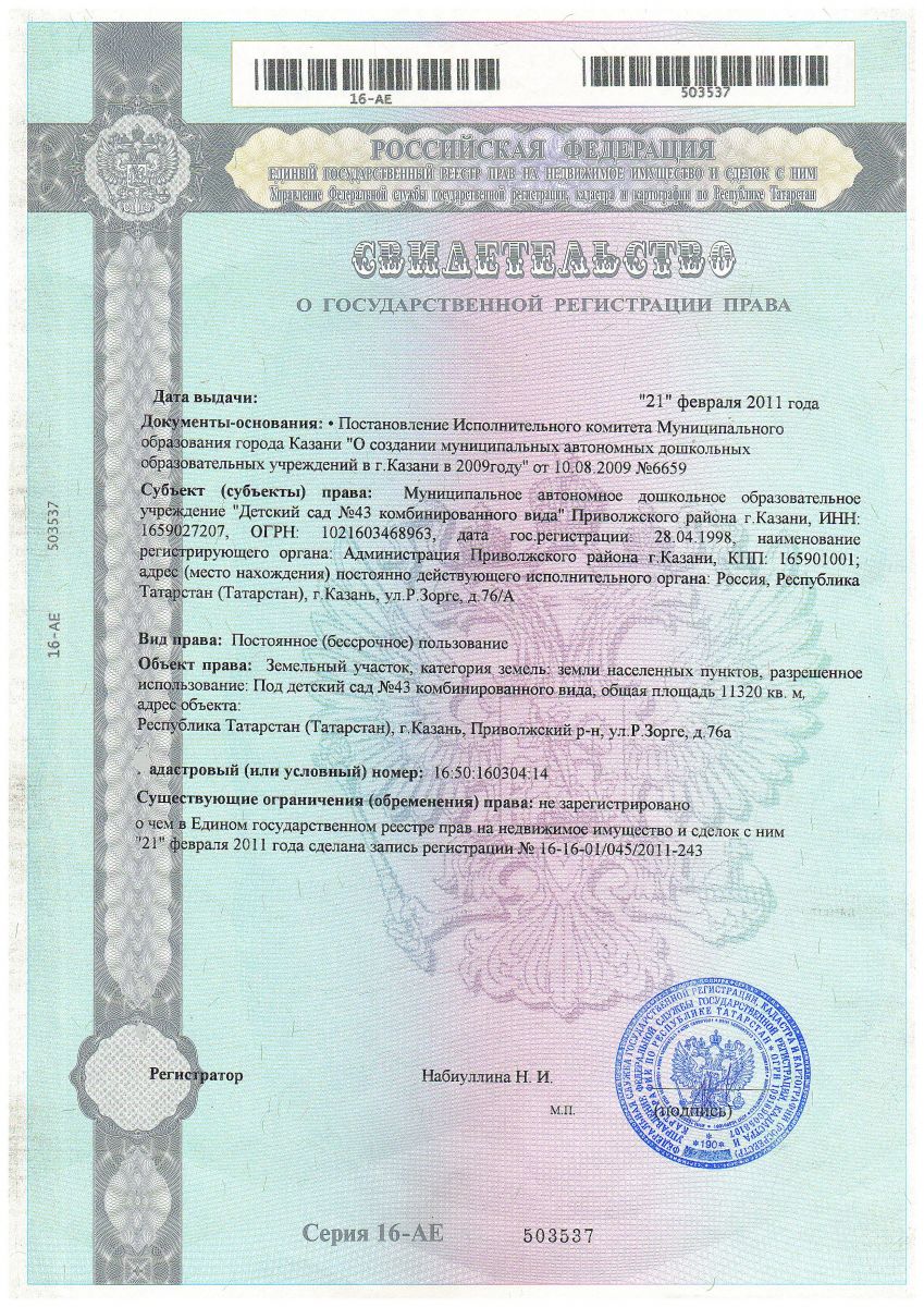 Свидетельство о гос. регистрации на землю 21.02.2011