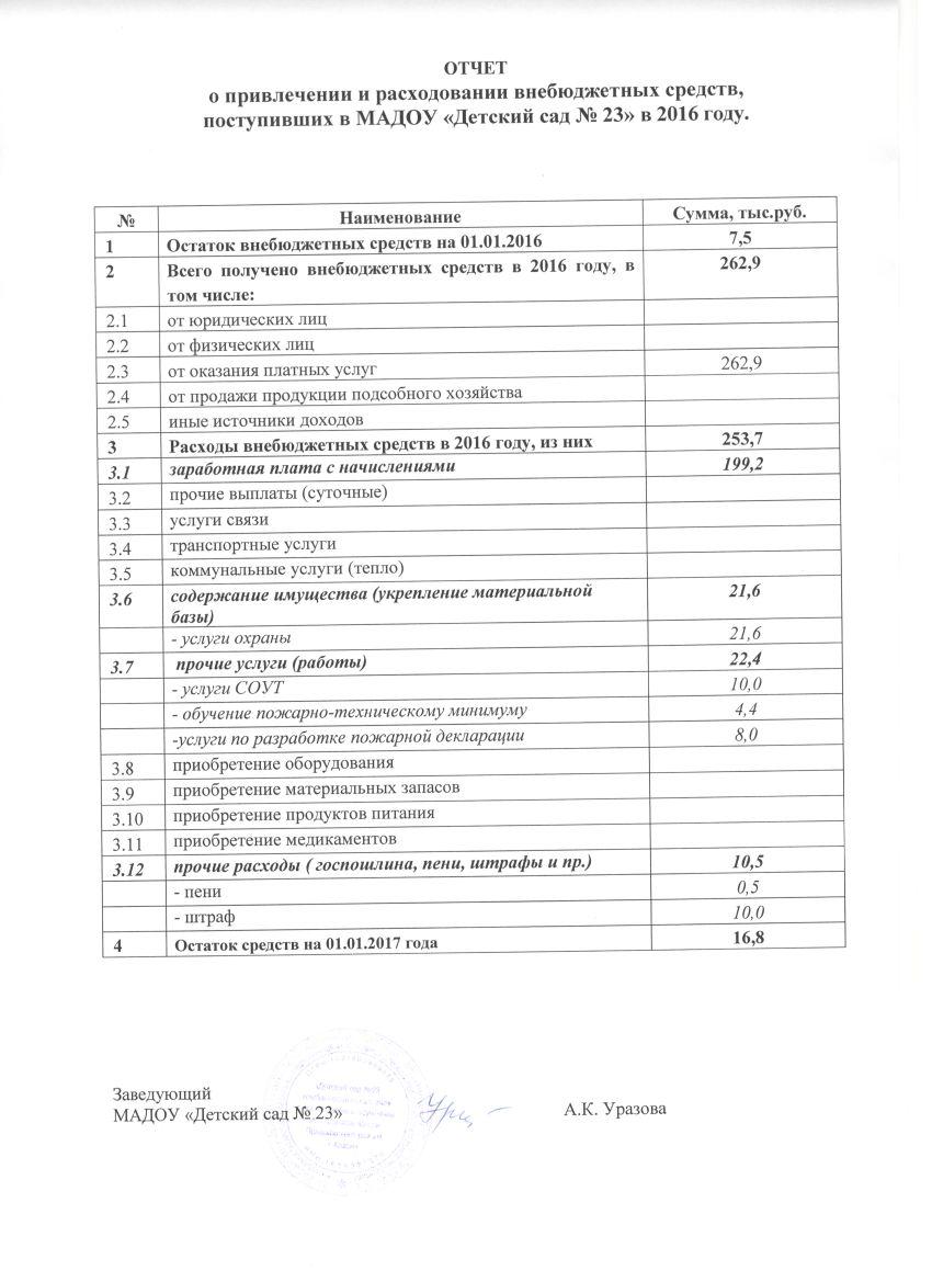 ОТЧЕТ О ПРИВЛЕЧЕНИИ И РАСХОДОВАНИИ ВНЕБЮДЖЕТНЫХ СРЕДСТВ ЗА 2016 ГОД