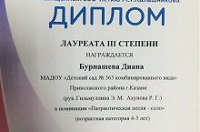 Поздравляем Бурнашеву Диану, ставшую лауреатом III степени в Республиканском конкурсе-фестивале «Патриоты России!» ( номинация «Патриотическая песня-соло») и педагогов Гильмуллину Э.М. и Ахунову Р. Г.!