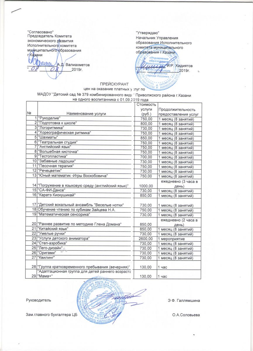 ПРЕЙСКУРАНТ ЦЕН на ОКАЗАНИЕ ПЛАТНЫХ УСЛУГ НА 2019-2020 УЧЕБНЫЙ ГОД