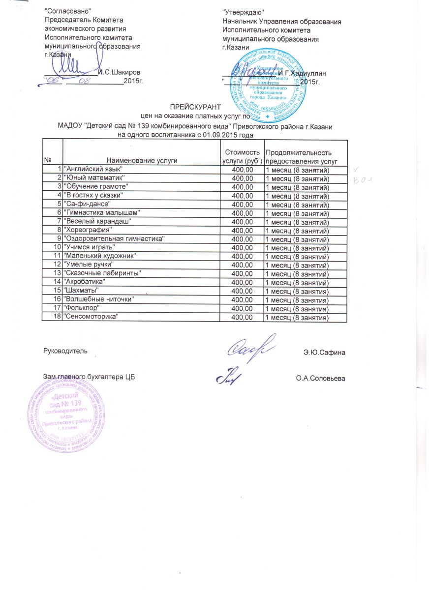Прейскурант цен на одного воспитанника с 01.09.2015