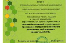 20.06.2017 г. МАДОУ №42 вручено свидетельство о присвоении статуса пилотной площадки ПМК ДО "Мозаичный ПАРК" издательством "Русское слово-учебник".