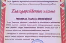 10.02.2017 руководитель учреждения Царькова Л.А. была награждена Благодарственным письмом УО О г.Казани по Вахитовскому и Приволжскому районам за плодотворную работу в составе членов жюри районного конкурса профессионального мастерства "Учитель года - 2017 "
