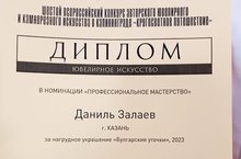 В 2023 году в г. Калининград состоялся VI Всероссийский конкурс авторского ювелирного и камнерезного искусства «Кругосветное путешествие». В номинации «Профессиональное мастерство» дипломом отмечена работа «Булгарские уточки» нашего преподавателя, мастера производственного обучения Даниля Рафкатовича Залаева! Поздравляем и желаем дальнейших творческих успехов.