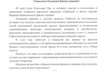 Глава администрации Вахитовского и Приволжского районов Салихов Альберт Иршатович выражает свою благодарность директору и коллективу ГАПОУ «Казанский техникум народных художественных промыслов» за активное участие в организации и проведении татарского народного праздника «Сабантуй» в жилом массиве Мирный Приволжского района города Казани.