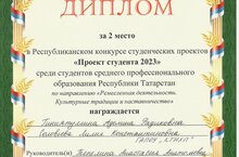 Поздравляем студентов техникума Гиниятуллиу Аделину и Соловьеву Лилию, занявших 2 место в Республиканском конкурсе студенческих проектов «Проект студентов 2023» среди студентов среднего профессионального образования Республики Татарстан по направлению «Ремесленная деятельность. Культурные традиции и наставничество». Выражаем благодарность за подготовку студентов преподавателю Тепелиной А.А.
