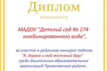 С целью сокращения детского дорожно- транспортного травматизма , формирования у детей стереотипов законопослушного поведения на дорогах в детском саду был проведен конкурс поделок " Я, дорога и мой железный друг" результатом которого стало получение диплома районного конкурса за активное участие групп среди дошкольных образовательных организаций Приволжского района. Желаем безопасных дорог и творческих успехов !