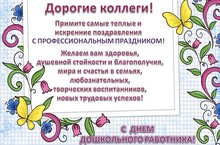 Уважаемые мои коллеги, поздравляю вас с профессиональным праздником! Пожелать нам всем хочется стойкости и терпения, уважения ребятишек и понимания родителей, успешной деятельности, результативности и отличных показателей, здоровья, семейного благополучия и только положительных эмоций.