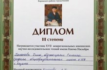 Сертификаты участников: Зиганшина Камиля 10А (учитель Зиганшина А.Н.), Хазеева Язгулем 10А (учитель Уразгильдина Г.Н.), Хайрутдинова Диляра 8Л (учитель Мазаева И.М.). -