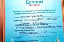 Диплом III степени в городской научно-исследовательской конференции школьников "Интеллект. Карьера" у учащейся 9В класса Хазеевой Язгулем. Учитель биологии Уразгильдина Г.Н.