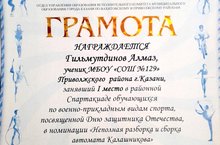 1 место в номинации "Неполная разборка и сборка автомата Калашникова" - Гильмутдинов Алмаз 9Б класс;
