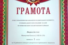 Диплом II степени II городского экологического фестиваля конкурса детского и юношеского творчества "Зеленая планета" у учащихся 5В класса Яшагиной Юлии и Гумирова Кирила. Учитель музыки Сабирова Л.А.
