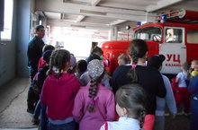 Ребята лагеря посетили Учебный центр пожарных РТ по улице Техническая, 13. Познакомились с деятельностью центра, увидели средства противопожарной безопасности, наблюдали за работой пожарных учебного центра. Среди учащихся лагеря была проведена спортивная программа по противопожарной безопасности, конкурс рисунков «Берегись!»