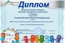 Гараев Карим, Гилметдинова Ралина награждены дипломами I степени Всероссийского конкурса «Лучшее портфолио школьника» (Педагог - Хусаинова Д.К)