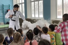 Позавтракав, ребята играли в «Вышибалы», отгадывали песни из мульфильмов. А также посетили школьный музей. После обеда, все дружно отправились на химическое шоу.