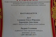 Поздравляем лауреатов 1 степени районного этапа конкурса вокальных дуэтов «Две звезды – 2017» Алешину О.Ю. и Берсанову Анастасию. Желаем победы на городском этапе конкурса!