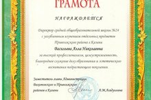 Директор нашей школы Васильева Алла Николаевна награждена Грамотой от администрации Приволжского и Вахитовского районов г. Казани «За высокий профессионализм, целеустремленность, благородное служение делу образования и эстетического воспитания подрастающего поколения». Поздравляем!