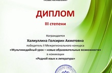 Поздравляем! Учитель татарского языка и литературы Халиуллина Голсирин Ахметовна участвовала во II Межрегиональном конкурсе «Мультимедийный урок – новые образовательные возможности» и заняла III место в номинации «Родной язык и литература».