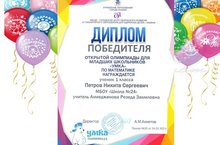 Ученик 1 класса Петров Никита (учитель Ахмеджанова Р.З.), стал ПОБЕДИТЕЛЕМ Республиканской олимпиады «Умка» по математике. УМНИЧКА! Мы гордимся тобой!