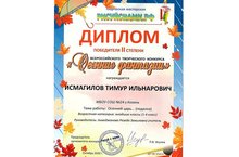 Исмагилов Тимур (учитель Ахмеджанова Р.З.), принял участие во Всероссийском творческом конкурсе "Осенние фантазии" и стал ПОБЕДИТЕЛЕМ (II место). Молодец! Поздравляем!