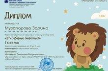 Музапарова Зарина участвовала во всероссийском конкурсе детского рисунка "Эти забавные животные" и награждена дипломом за 1 место, а педагог-организатор Матвеева С.В. получила благодарственное письмо за подготовку участника. Молодцы! Поздравляем!