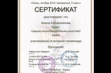 Поздравляем Алину Сапарниязову ученицу 5Б класса (кл.рук. Сирязеева Т.С.) за участие в открытой международной математической интернет-олимпиаде для школьников "Осень, октябрь 2016, математика 5 класс"