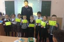 В начальных классах состоялась встреча с сотрудником ДПС. Он рассказал первоклассникам о том, как нужно себя вести на дороге, и подарил им светодиодные смайлики.