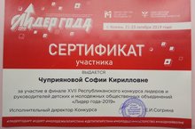Ученица 6а класса Чуприянова София участвовала в республиканском конкурсе "Лидер года-19", который проходил в лагере "Волга" и получила сертификат участника. Спасибо большое за подготовку и участие. -