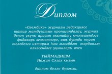 "Сөембикә" журналы редакциясе татар матбугатын пропагандалау, журнал белән укучы арасын якынайту юнәлешендәге фидакарь хезмәтләре, яшь буында туган телебезгә ихтирам һәм мәхәббәт тәрбияләу өлкәсендәге унышлары өчен.